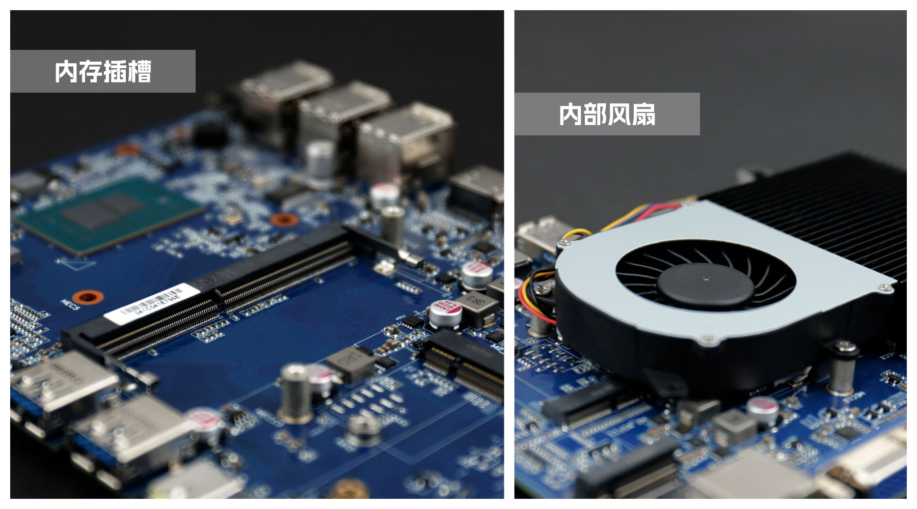 k8.com桌面云终端Y-BOX S2主板中部是内存插槽,采用单通道笔记本内存槽设计,最大支持容量可达32GB,最高支持DDR4-3200MHz频率,横插的形式可以减少主板的占用体积,使整体机身更紧凑,内存顶部的风扇起到高效散热的作用。