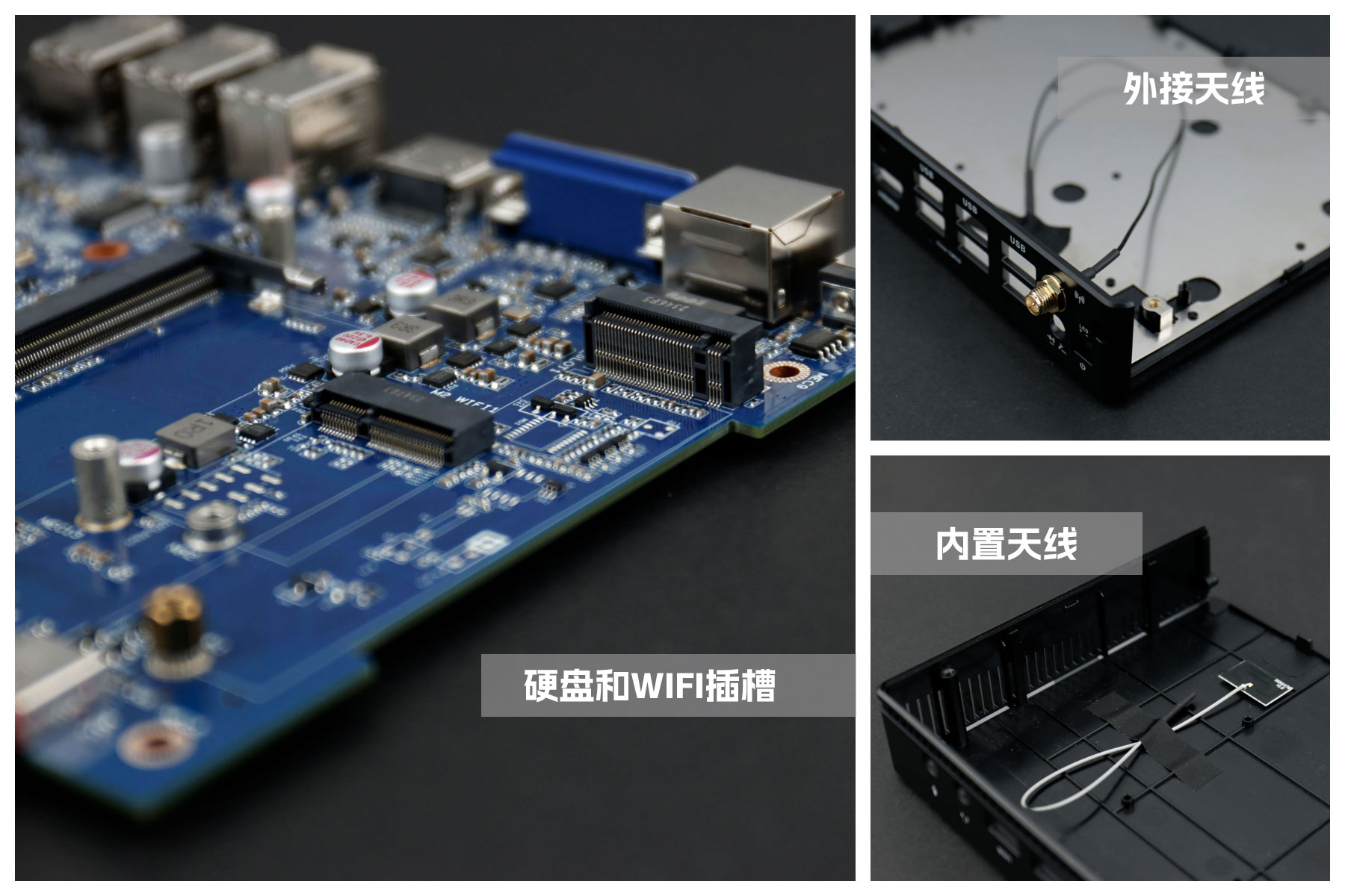 k8.com桌面云终端Y-BOX S2主板上配备了 1个 M.2 固态硬盘位,接口规格为 PCIe3.0 标准,匹配标准的 2280 规格硬盘。一侧还有一个M.2接口,匹配2230长度的WIFI/BT模块插槽,WiFi模块可以连接的是外接天线,增强信号,同时也可以内接天线,灵活应用,支持Wi-Fi 5/6/6E网络。