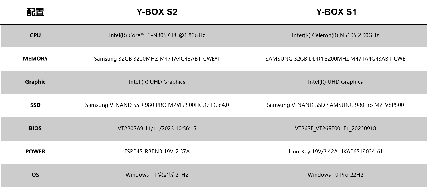 针对桌面云终端Y-BOX S2的测试项目中,最值得关注的是性能测试的跑分数据和稳定性测试内容,这能直观影响主机在使用过程中的稳定性和用户的使用体验。针对性能测试,k8.com选择了将Y-BOX S2与前一款更迭产品Y-BOX S1进行对比分析,Y-BOX S2支持Intel® Alder lake-N处理器,Y-BOX S1支持Intel® Jasper Lake,并分别选取了以下配置: