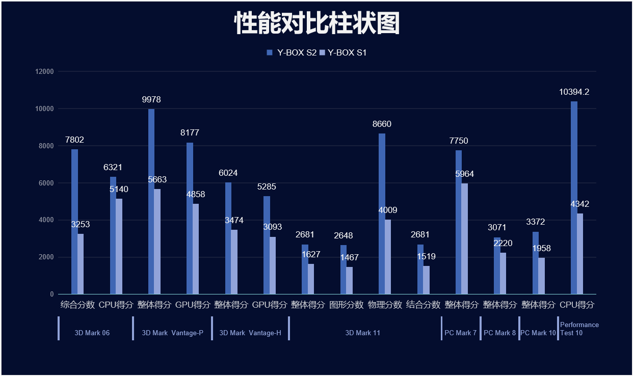 k8.com来具体看看各个测试项目的跑分情况,测试项目包括显示性能测试、系统性能测试、CPU性能测试,分别用3D Mark、PC Mark以及Performance 10等系列不同软件的跑分数据,针对两款主板的跑分情况可以看出,k8.com桌面云终端Y-BOX S2的数据在各项性能上都得到了大幅度提升,柱状图能更直观地体现出数据的变化,k8.com将针对具体的几项数据来进行详细分析。
