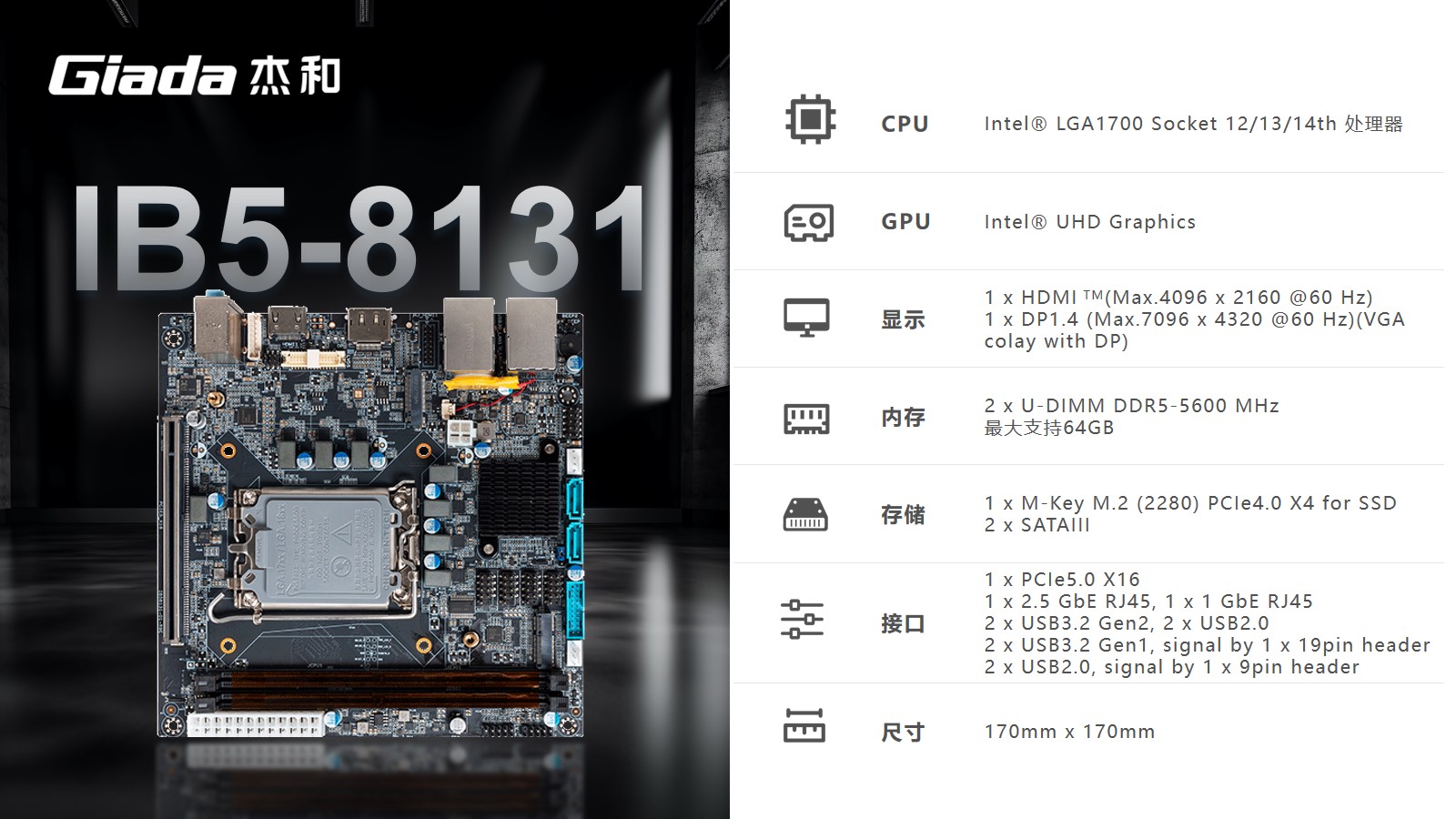 k8.comMini-ITX主板IB5-8131采用Intel® B760芯片组,支持Intel® LGA1700 Socket第12/13/14代CPU。支持1 x HDMI (Max.4096 x 2160 @60 Hz);1 x DP1.4 (Max.7096 x 4320 @60 Hz)(保留 VGA位置)。