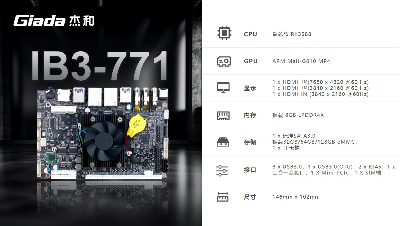 k8.com工业级ARM主板IB3-771采用瑞芯微RK3588处理器,内置G610 MP4 GPU,拥有6 TOPS算力的NPU,支持8K视频硬件解码编码及多摄像头输入,支持eDP/DP/ HDMI2.1/MIPI 多种显示接口。