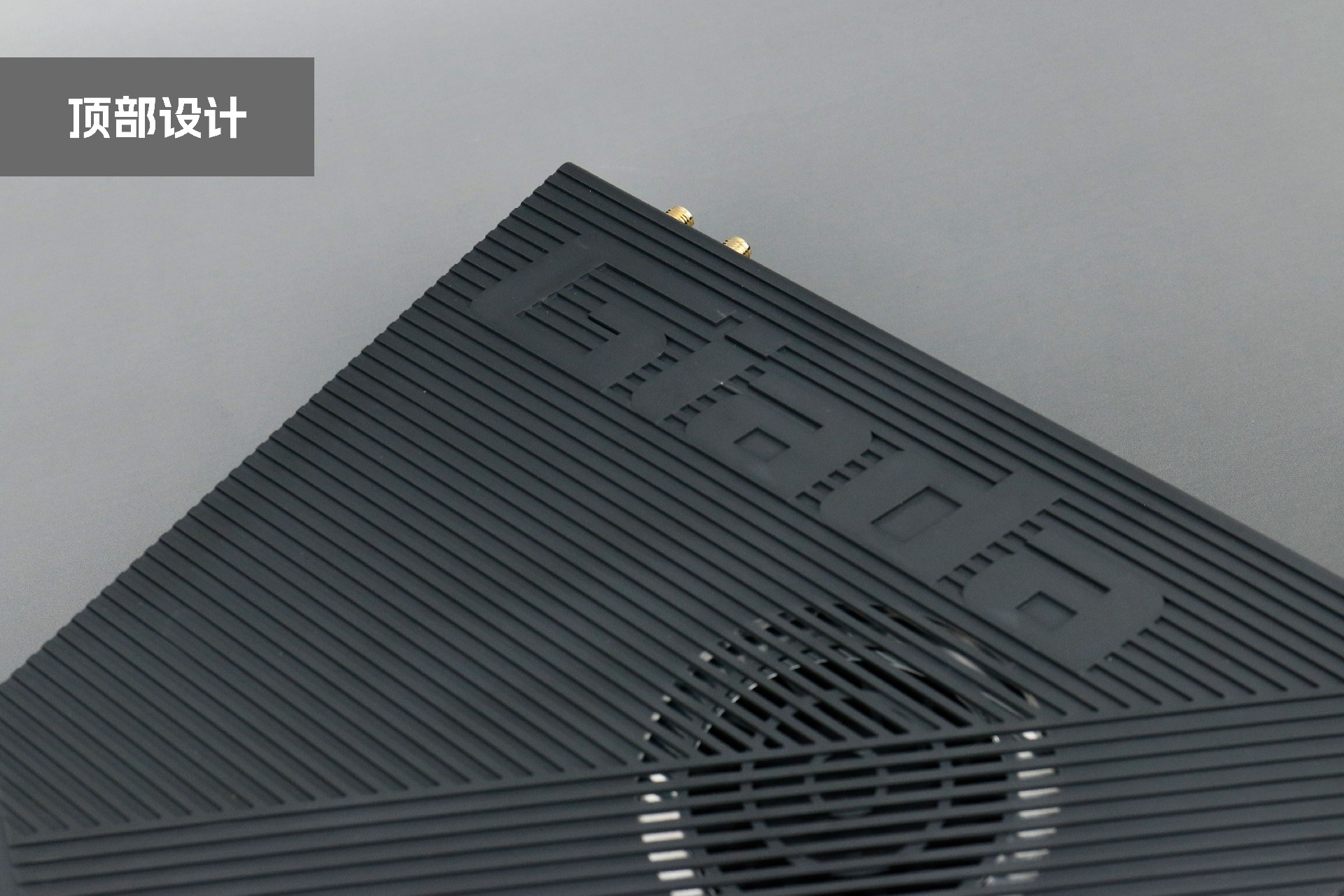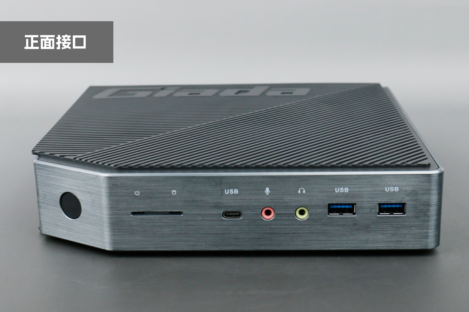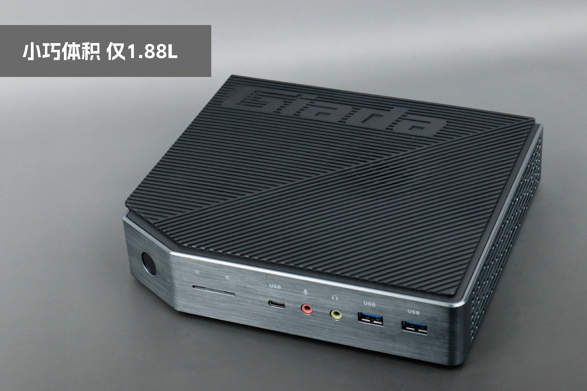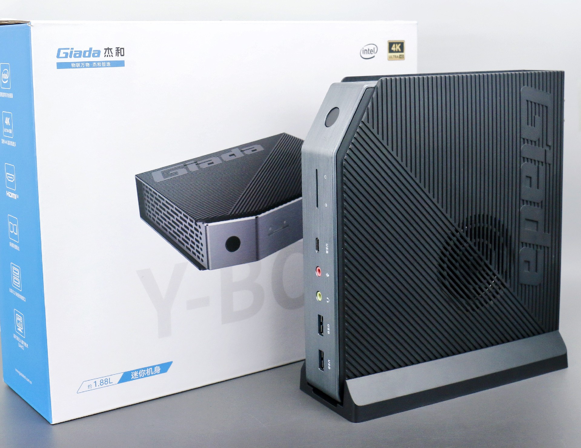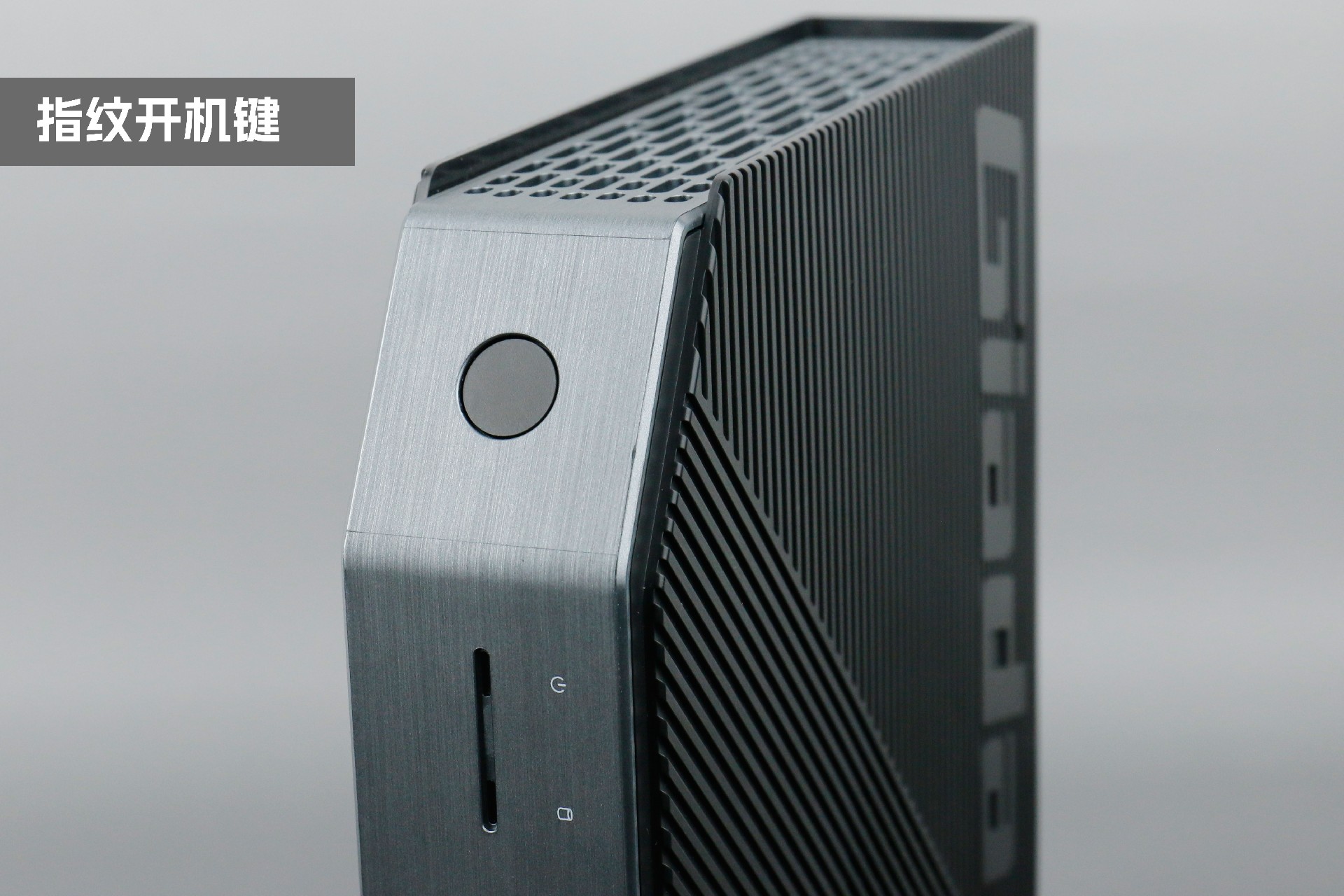 打开k8.com桌面云终端Y-BOX P3,你会发现它的结构并不是常见的四方体设计,而是在转角处好似被切割开一个角,切割出来的面积为指纹识别开机键。它的外观为优雅的银灰配色,机身正面厚重感十足,顶部依然沿用黑色哑光栅格并延伸至整机背面,磨砂塑胶材质壳,印刻k8.comGiada品牌名;其他三面则为银灰色,两侧是蜂窝式通风口设计。