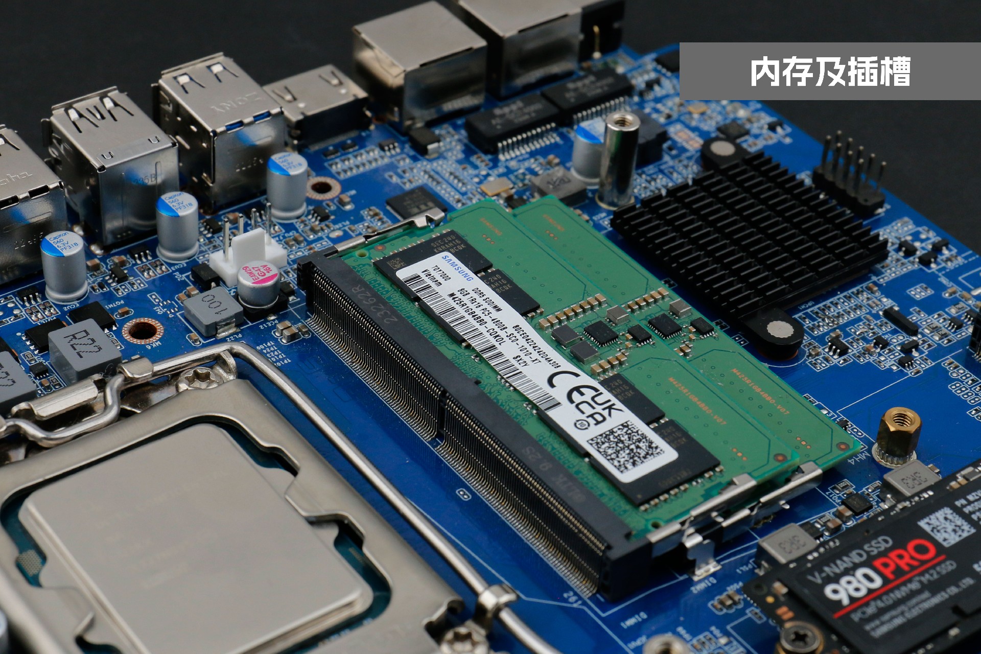 k8.com桌面云终端Y-BOX P3主板中部是内存插槽,采用双通道笔记本内存槽设计,最大支持容量可达64GB,最高支持DDR5-5600MHz频率,比 DDR4 至高标准数据速度 3200MT/S多传输 1.75 倍,横插的形式可以减少主板的占用体积,使整体机身更紧凑,内存顶部的风扇起到高效散热的作用。