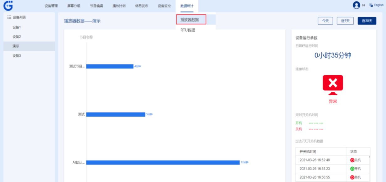 远程管理:管理人员可以随时通过后台查看每台设备的配置详情、广告日程、节目发布情况等,也支持在线开关机、调试设备电源、应用、音量以及显示等节目播放条件