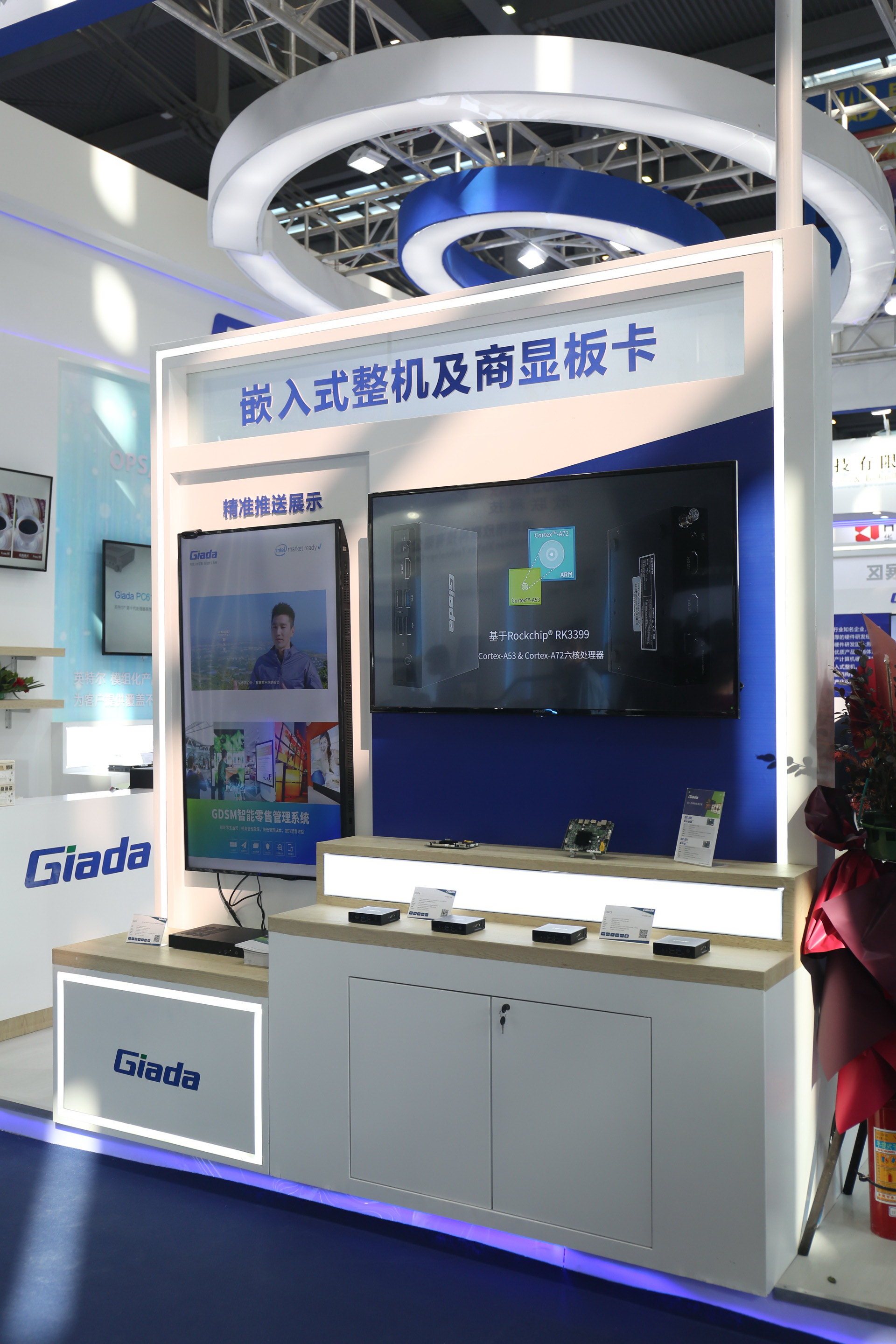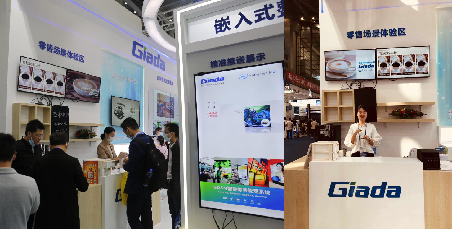 紧邻ARM架构商显产品集的精准推送展示区与零售门店模拟展区,共同组成了本届展会k8.com科技展位的一大精彩设计。场景展现了GDSM智能零售管理系统在零售门店场景下的展示效果,顶部的数字标牌由GDSM系统推送内容,模拟搭建了针对人流动线的广告精准推送形态。