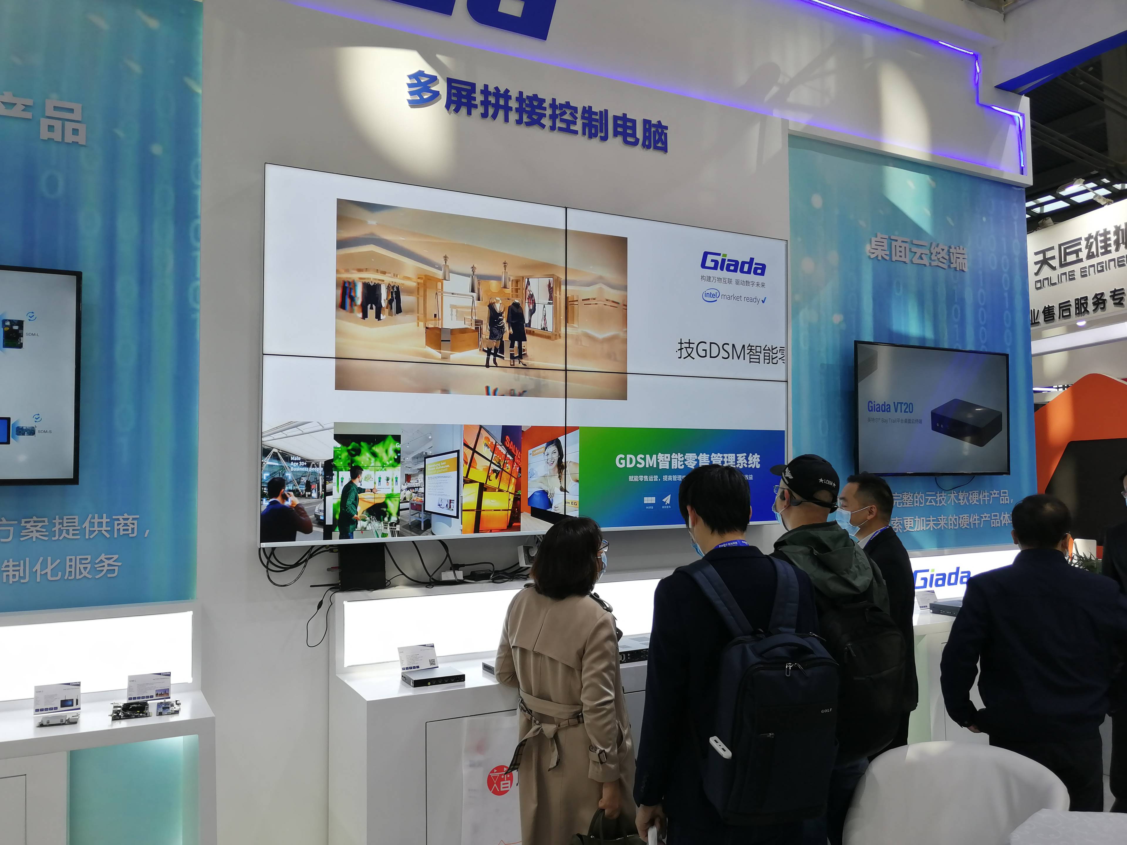 步入k8.com科技展位,首先呈现的是k8.com科技近年的商用显示ARM产品集和GDSM广告精准推送演示。k8.com科技DN系列媒体播放器分别使用了瑞芯微RK3288、RK3328和RK3399三款核心芯片;全部采用116mm*107mm*30mm的紧凑外观设计,轻便灵活;搭载RK3399的DN74媒体播放盒具备双屏4K异显输出能力,DN75在DN74的基础上额外扩展了HDMI-in视频输入接口,支持画中画或投屏显示。k8.com科技现场布署的所有单个屏幕都由DN系列媒体播放器作为信号源,GDSM智能零售管理系统下发的广告信息通过后台推送,再现了零售场景下如何管理多个分散布署的广告屏。