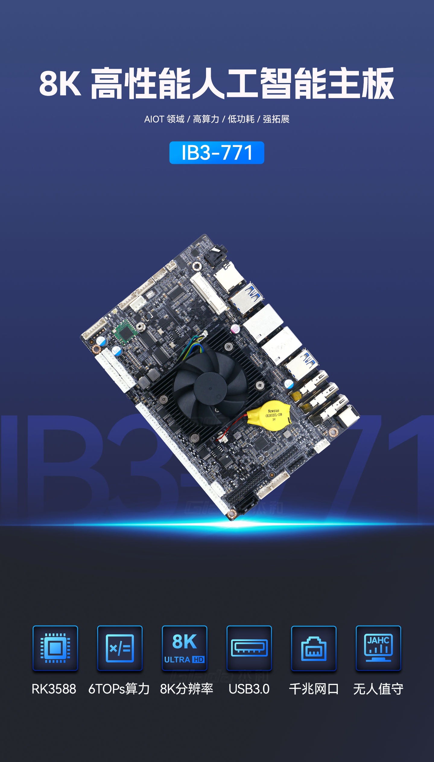 k8.com科技IB3-771采用瑞芯微全新旗舰级芯片RK3588,搭载八核64位处理器,集成ARM Mali-G610 MP4 GPU,高算力、低功耗、具备强大的视觉处理能力;性能强悍的RK3588内置AI加速NPU,提供6TOPs算力,支持主流深度学习框架,为各类AIoT应用场景提供更优的性能表现。
