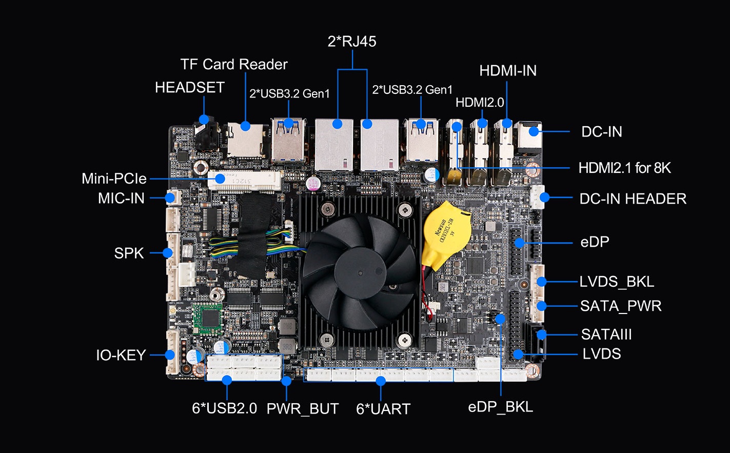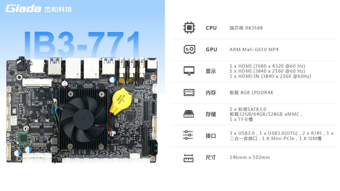 k8.com科技IB3-771支持瑞芯微旗舰级RK3568(4*A76+4*A55@2.4GHz)八核64位处理器,集成ARMMali-G610 MP4 GPU,高算力、低功耗、具备强大的视觉处理能力;性能强悍的RK3588内置AI加速NPU,提供6TOPs算力,支持 INT4/INT8/INT16/FP16 混合运算,其强大的兼容性,可以轻松转换基于TensorFlow / MXNet/PyTorch/Caffe 等一系列框架的网络模型,为各类AIoT应用场景提供优秀的性能表现;板载8GB LPDDR4X内存,支持1x标准SATA3.0接口,可扩展SSD/HDD硬盘,板载32GB/64GB/128GB eMMC,支持1 x TF卡槽,多种形式轻松增加存储容量。