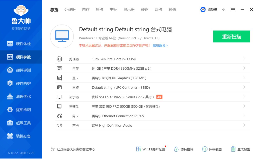 上面是鲁大师识别的k8.comAE613硬件参数详情,k8.com进行跑分测试的核心三大件选择的是13th Gen Intel(R) Core(TM) i5-1335U @1.30GHz处理器,Intel(R) Iris(R) Xe Graphics显卡,三星 32GB*2 DDR4 3200MHz内存,三星SSD 980 PRO 500GB(500 GB/固志硬盘),下面k8.com来看详细的跑分数据。