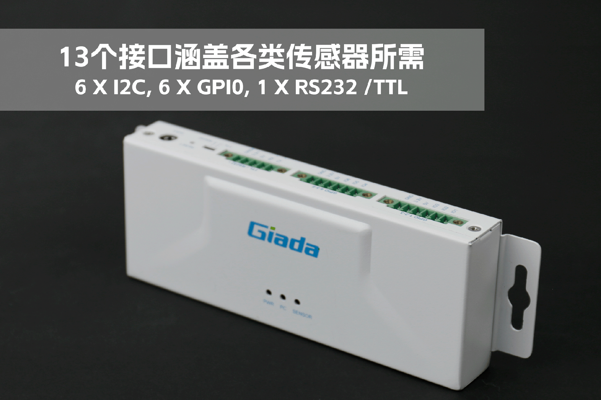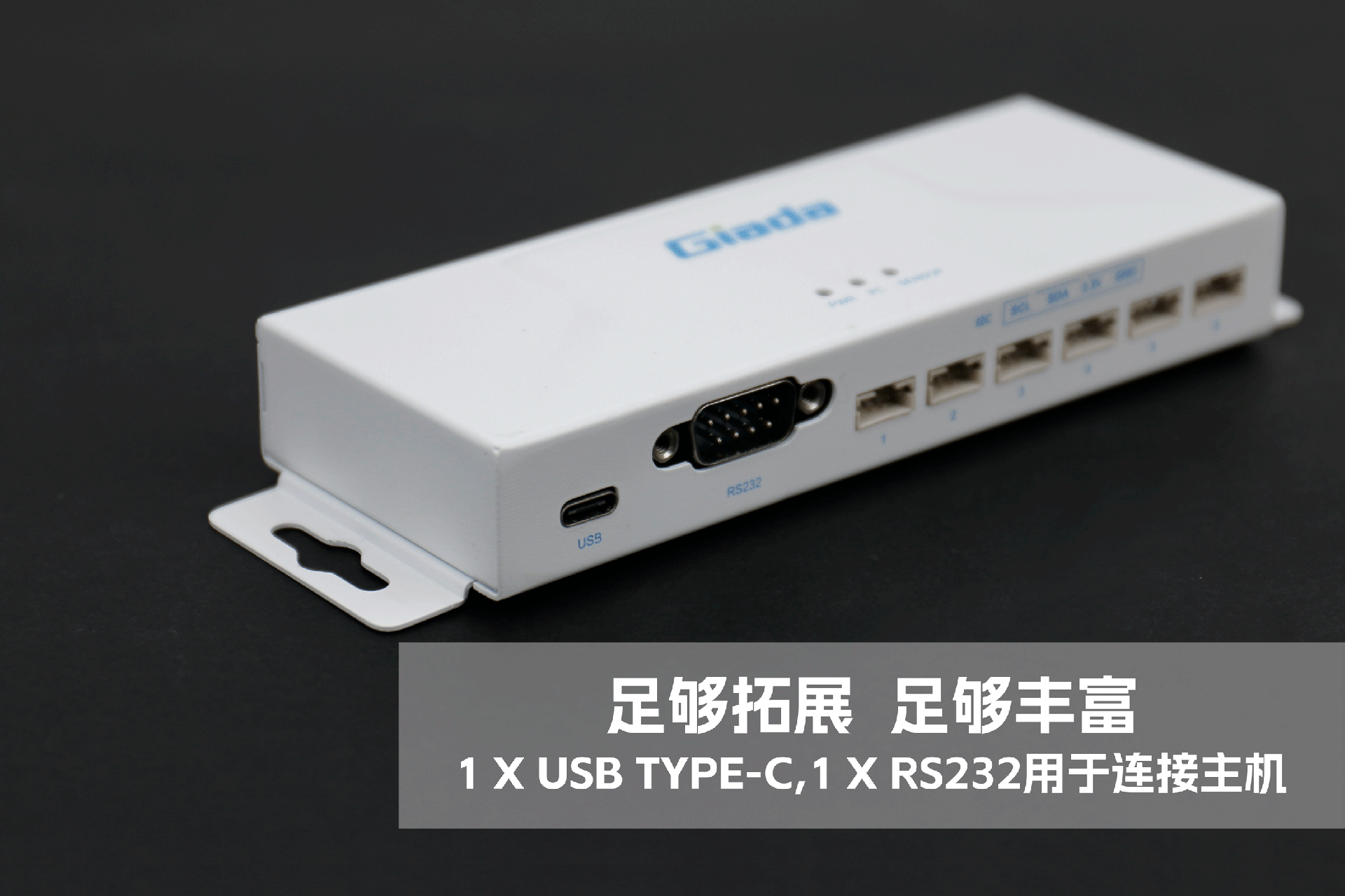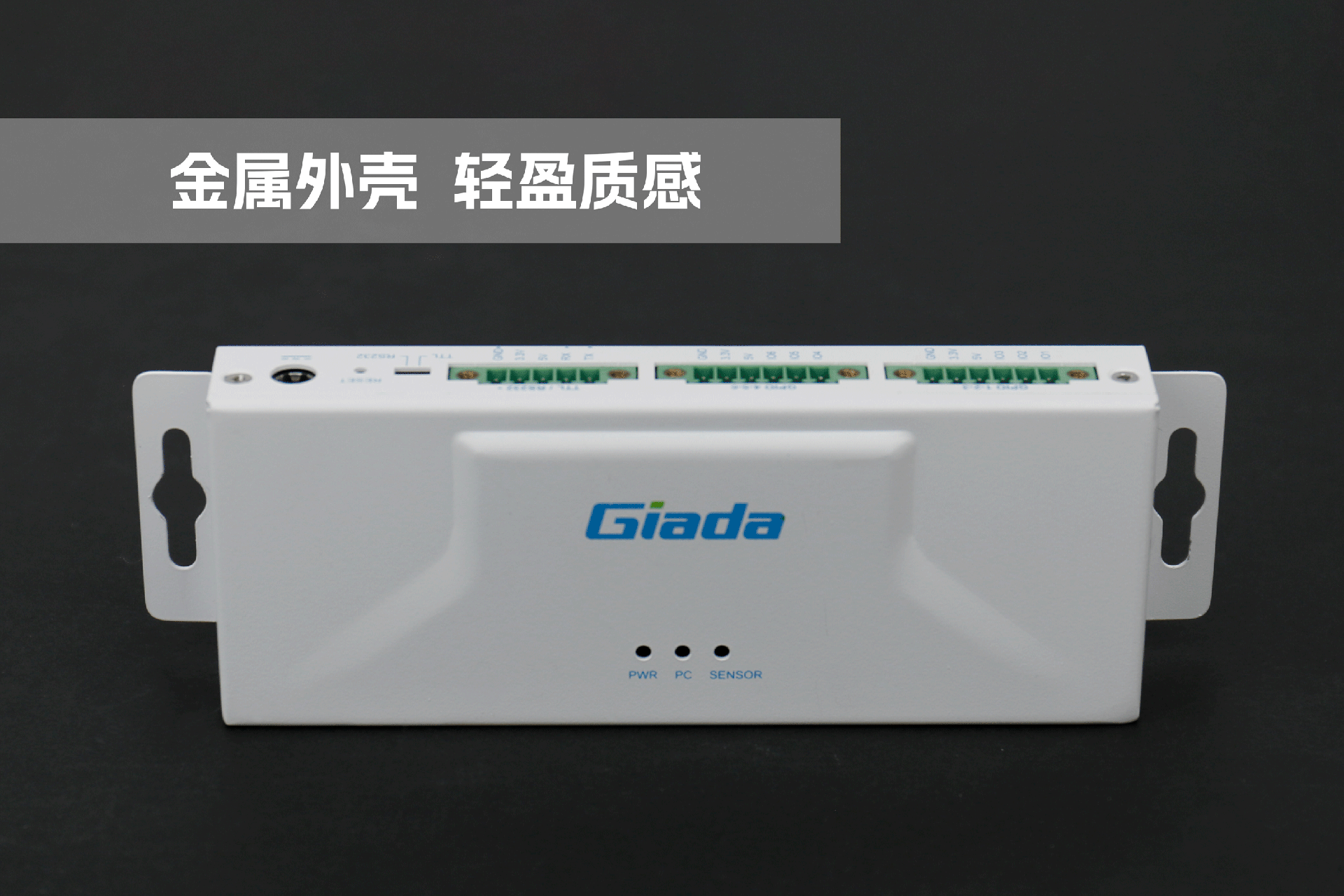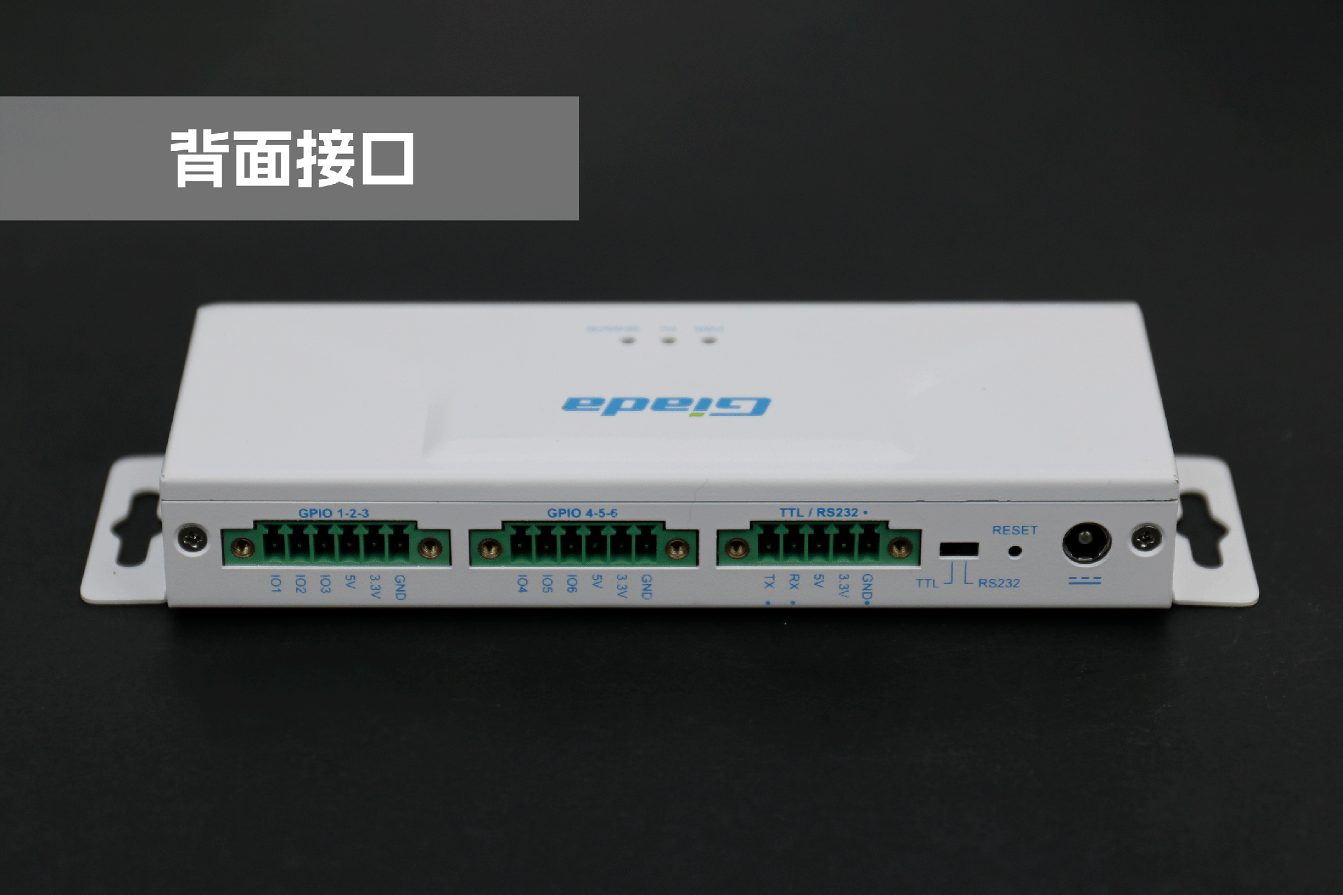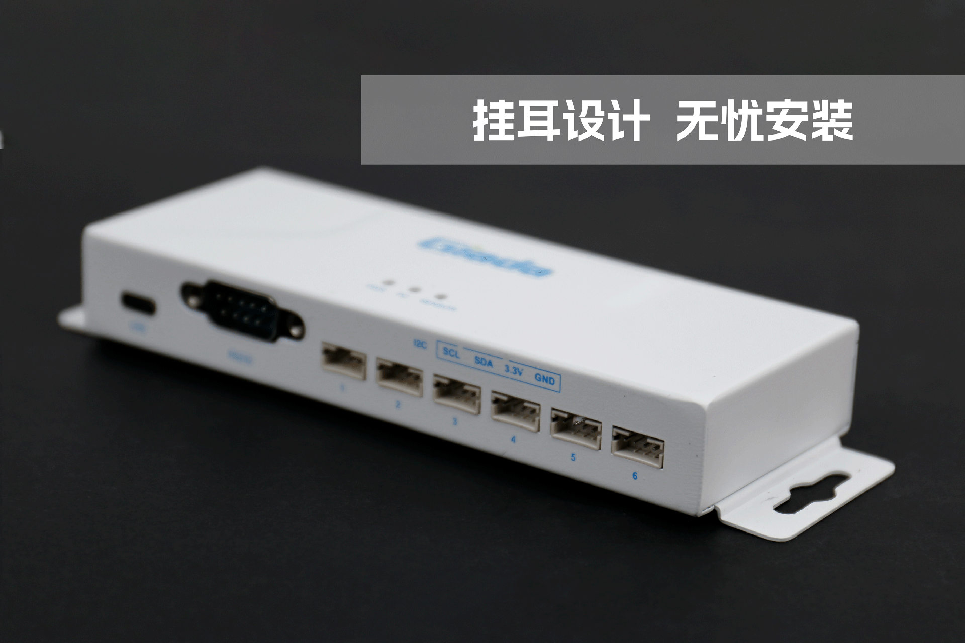 k8.com物联网拓展坞RD01外部为白色,顶部印制k8.comGiada的彩色logo,外壳采用金属材质,左右两侧设计同材质挂耳,可以方便用户固定设备。